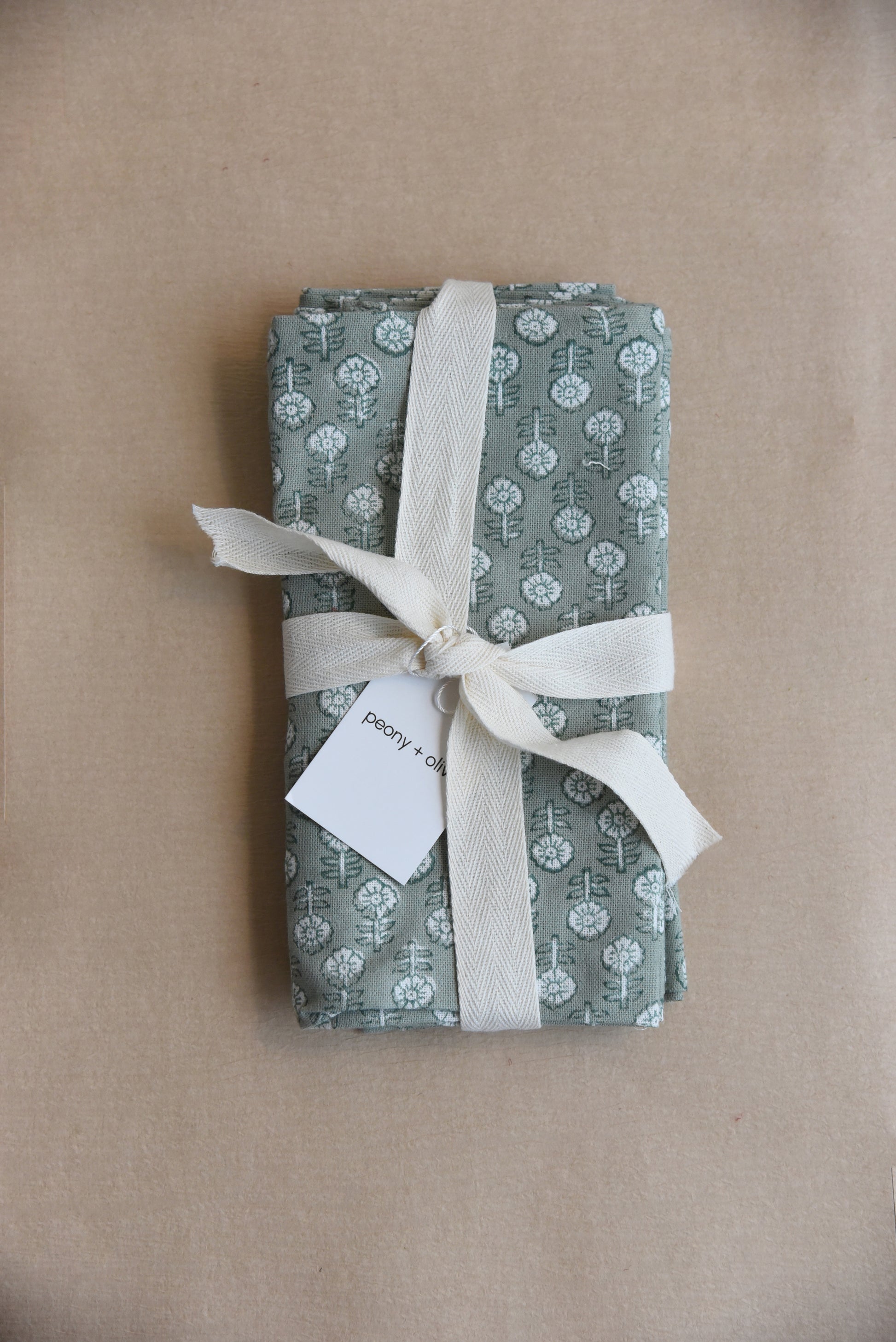 Handcrafted in India using traditional hand block printing techniques, our Ruthie Block Print Napkins feature a soft, muted green floral pattern on durable cotton canvas. This set of four cloth napkins brings a touch of warmth and beauty to your table, perfect for everyday meals or special gatherings. The timeless floral design pairs beautifully with napkin rings for an elevated tablescape. Made with care by skilled artisans, each napkin reflects the charm and character of a handmade piece.