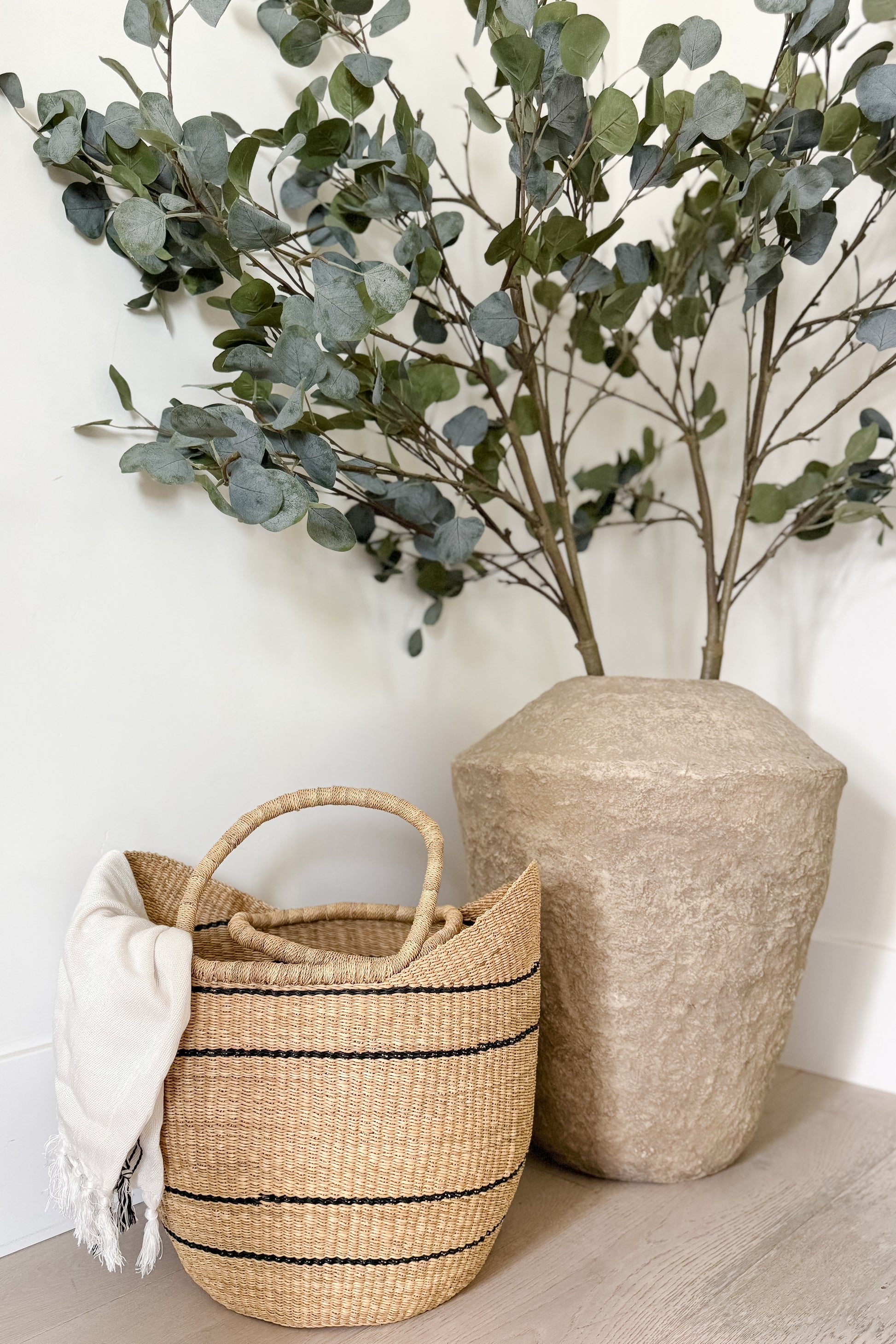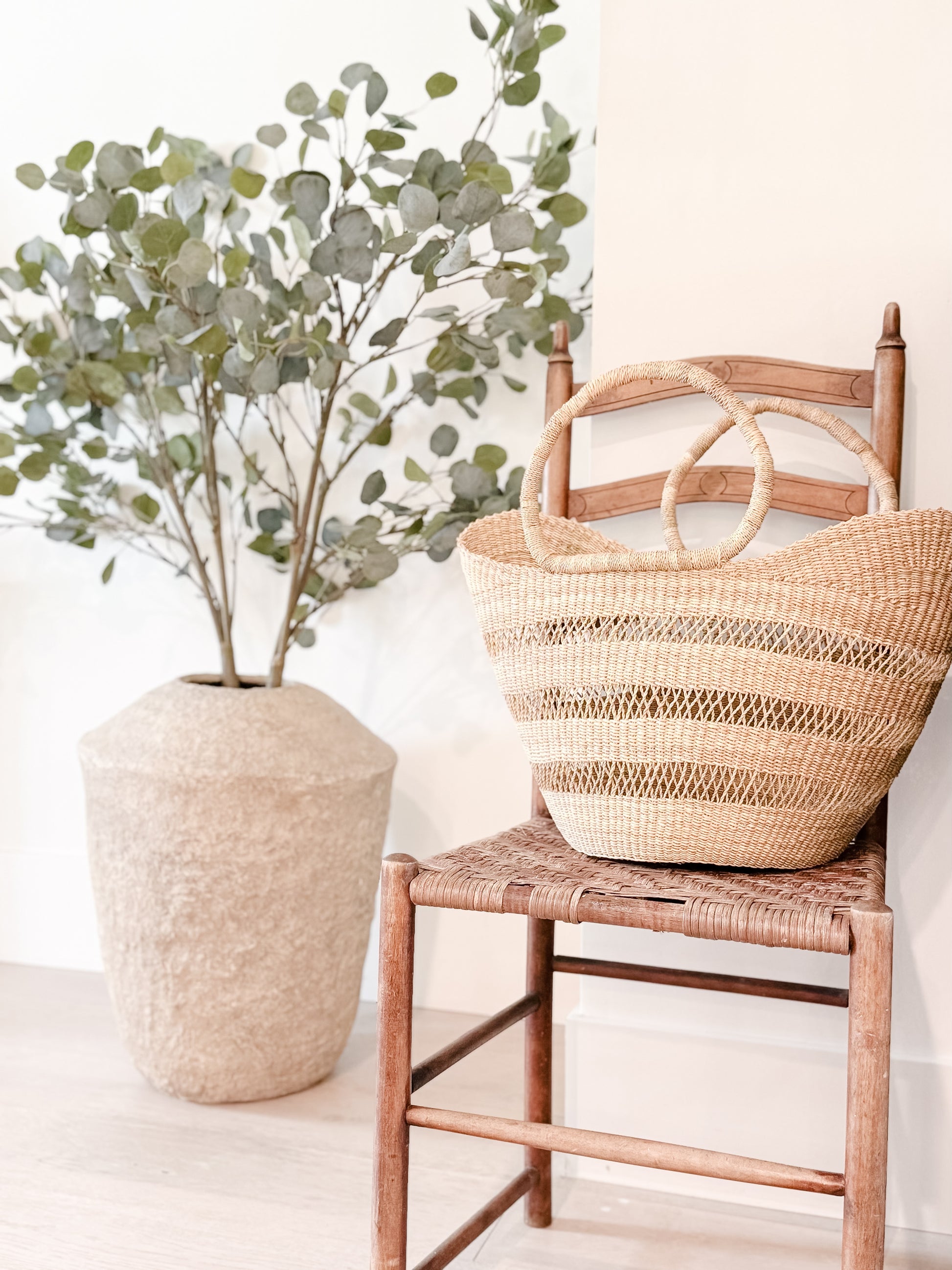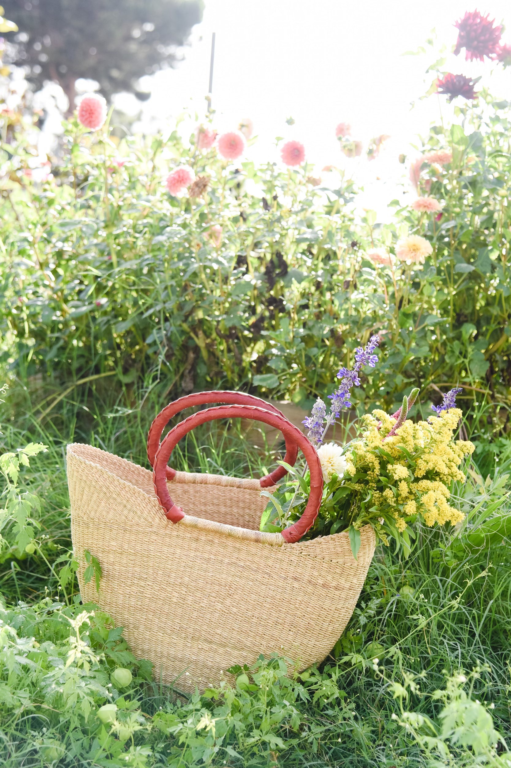 This handcrafted tote is exquisitely woven with natural grasses and has beautifully wrapped leather handles. It is made by artisans in Bolgatanga, a northern region of Ghana.